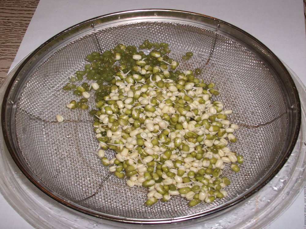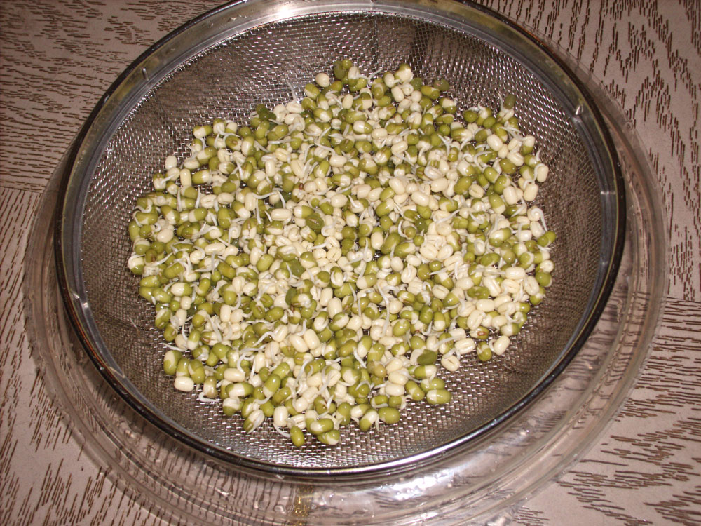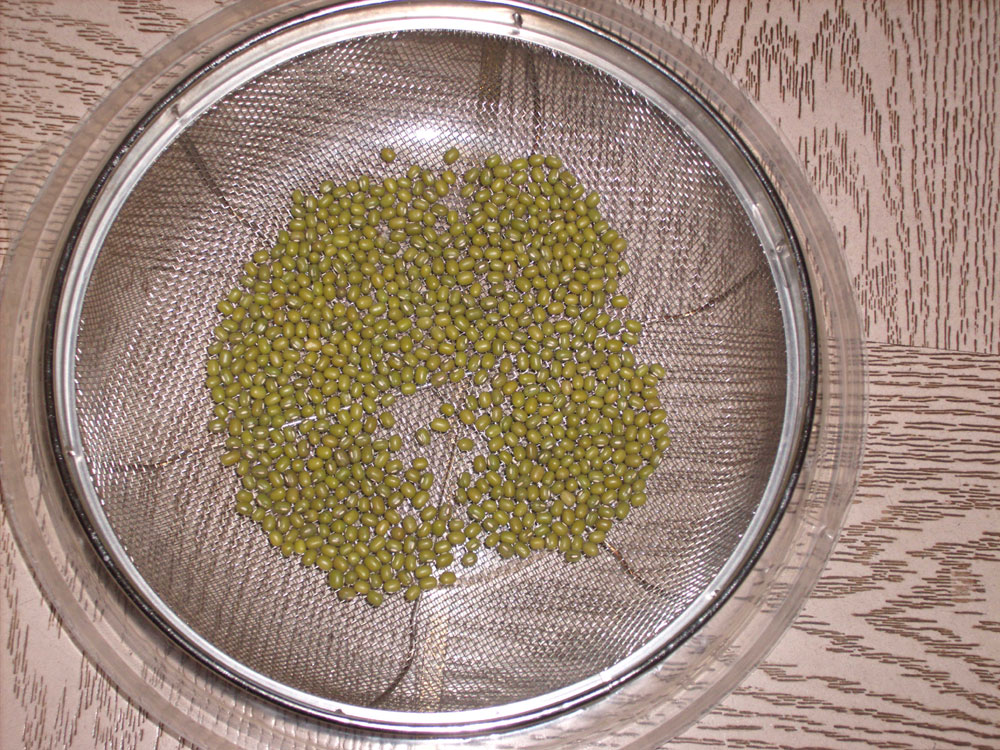 - у сито од нерђајућег челика сипамо 3-4 супене кашике Мунго пасуља и налијемо чистом филтрираном водом тек толико да вода додирне зрнца